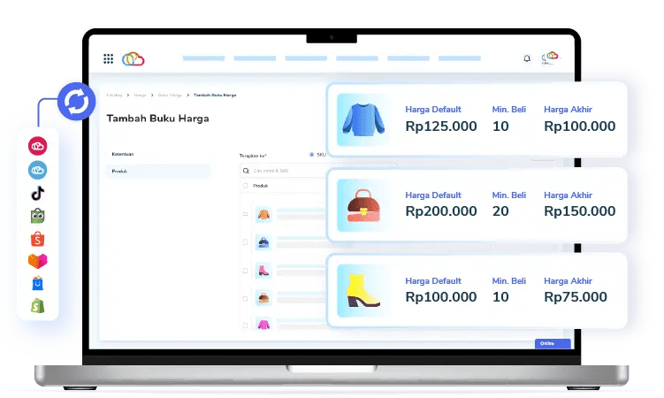 Dengan menggunakan fitur buku harga, semua harga bisa dikelola dari satu sistem, sinkron otomatis ke seluruh channel dan perubahan harga lebih cepat dan minim error.