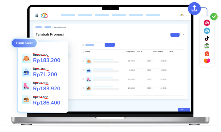 Maksimalkan promo dengan fitur Harga Coret Jubelio. Atur diskon dan harga promo di semua marketplace lewat satu dashboard praktis
